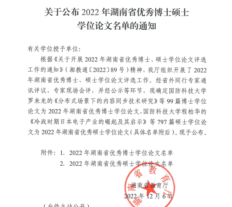 12月6日,湖南省教育厅发布《关于公布2022年湖南省优秀博士、硕士学位论文名单的通知》(湘教通[2022]333号)。樱花漫画