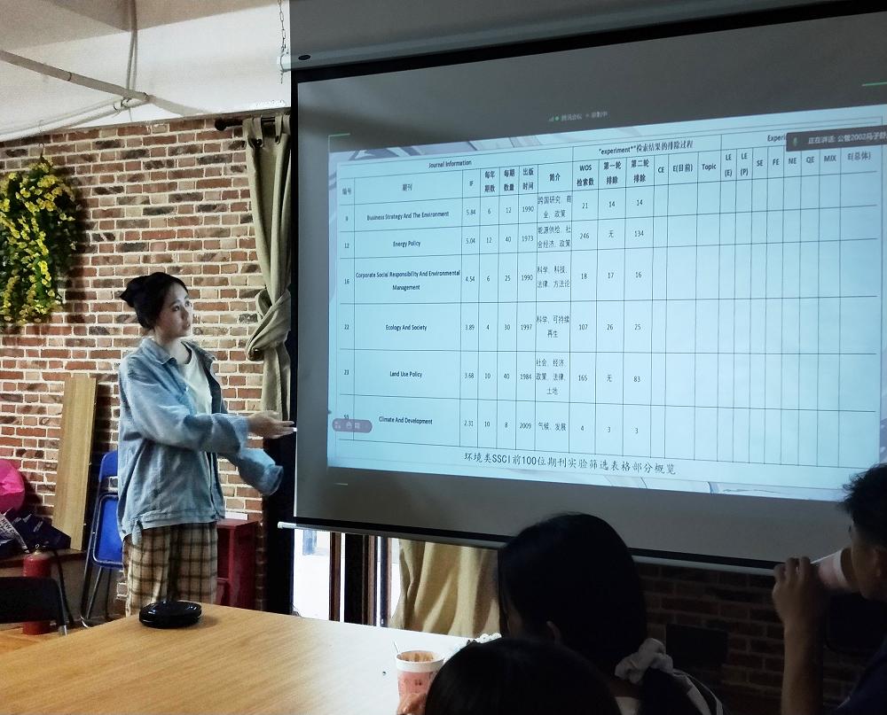 “珠峰计划”的一员,以《如何启动一项综述?——以环境类前100位SSCI期刊综述为例》为题进行了交流探讨。从文献的检索、筛选、下载、阅读、正式执行这几个方面介绍了综述启动流程。她指出从研究参与者的主题与类型,文献的语言方面,出版状况、年份这几方面入手,结合自身研究综述合理设定检索标准。在文献筛选上可以通过标题、摘要等来确定基本范围。关于文献下载,周同学介绍了一些关于英文文献下载的小tips:首选是在学校购买的数据库中下载,需要在学校的IP范围内,或者通过VPN下载,其次是查找文献所属数据库:谷歌学术/百度学术/必应国际再通过学校VPN(电子数据库)进入数据库免费下载以及直接向原作者求助或者是在research gate上面下载别人的文章。文献阅读重点在于自身需求,有针对性地阅读。在分享的最后,周佳逸同学提出了自己做研究综述的心得体会,现场的同学们反响热烈,并就如何高效启动文献综述研究进行了深入探讨。