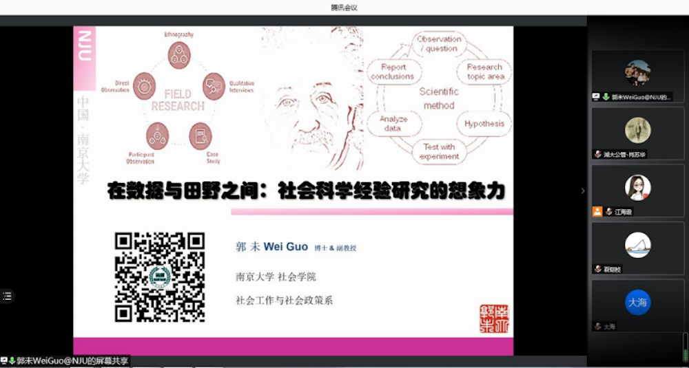 在本次讲座最后,郭未老师与线上师生展开积极互动,并就与会师生提出的有关“研究方向的选择和确定”“特定情境下的网络调查抽样方法使用”“如何进行深度参与式研究”“理论驱动与研究框架构建”及“问题导向与资料获取”等相关话题展开深入探讨和耐心解答。同时,郭未老师结合自身十余年来,潜心扎根田野开展社会科学经验研究的过程和经历,进行了宝贵的方法分享和经验总结。他指出,对于理论导向下的经验研究,在注重情感元素和价值元素之外更应兼具批判思维和谨慎判断维度之下的严谨的研究态度。