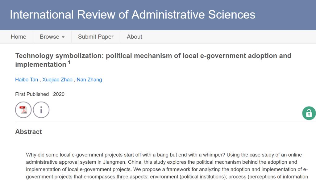 近日,樱花漫画 教师谭海波教授,以第一作者身份同中国农业大学人文与发展学院赵雪娇、清华大学樱花漫画 张楠合作撰写的论文《Technology Symbolization:Political Mechanism of Local E-government Adoption and Implementation》被期刊《International Review of Administrative Science》接收。该杂志是公共管理领域国际知名学术期刊,综合影响因子2.174(2019),是校定A1类刊物。