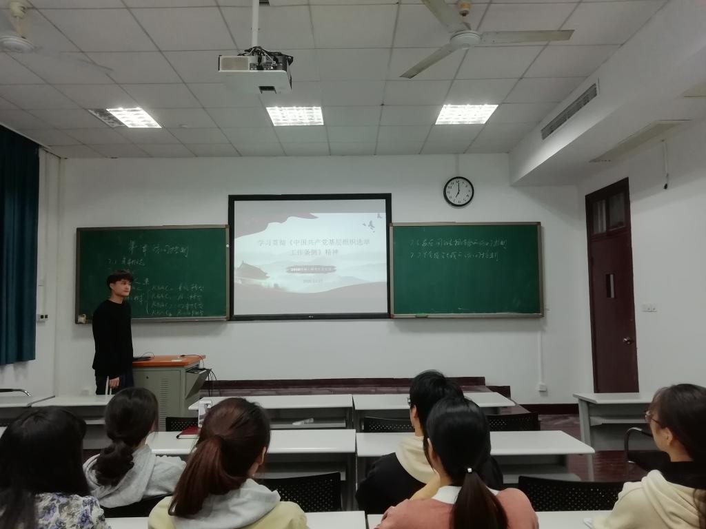 2020年10月23日19时,2019级研究生党支部在中楼115室召开“学习贯彻《中国共产党基层组织选举工作条例》精神”专题学习会。由支部书记周杨康主持会议,全体党员参会。
