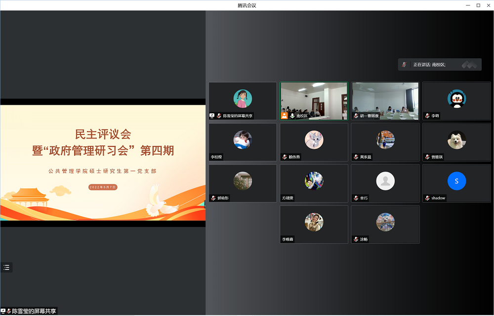 硕士研究生第一党支部召开2021年度民主评议会。会议由支部书记史钰宏主持,在南校区、北校区分别设置会场,会议应到党员36名,实到党员31名,5名党员采取线上会议形式参会。
