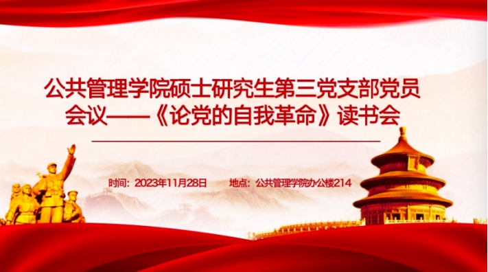 硕士研究生第三党支部在学院214室开展主题党日活动,深入学习了《论党的自我革命》一书,并积极探讨如何在“十四五”发展规划中充分发挥党员的先锋模范作用。会议由支部书记刘昱呈主持,支部党员积极参加。