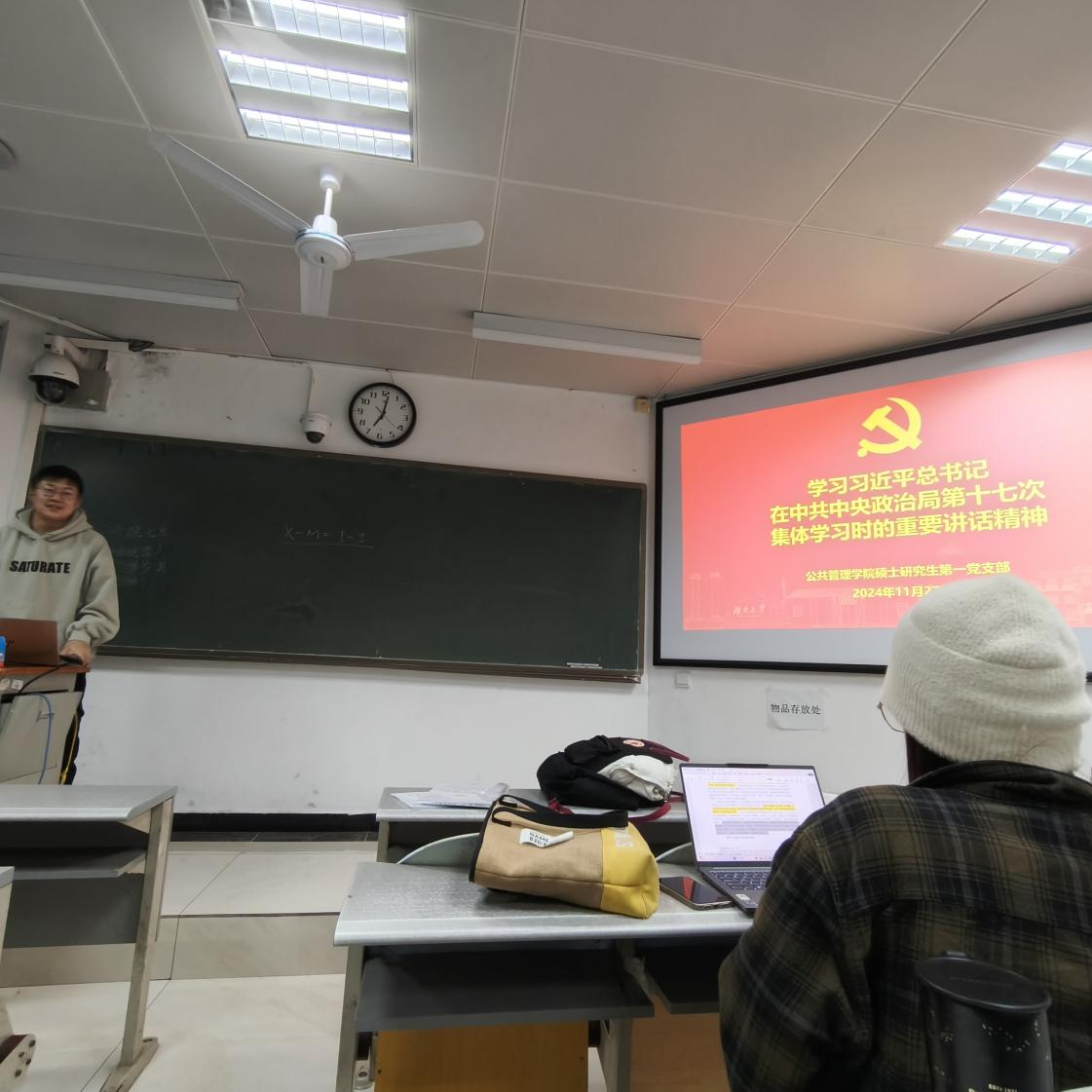 硕士研究生第一党支部于11月27日在水教206召开党员大会进行党课学习,并开展讨论接收预备党员相关事项,会议由支部书记于竞男主持。