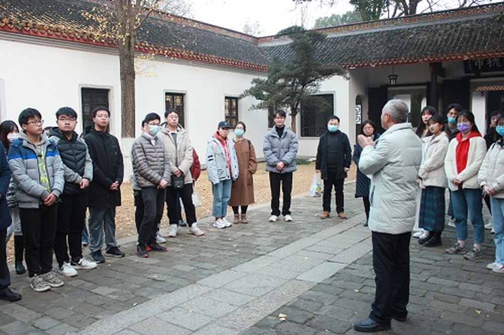 最后,一行人来到了岳麓书院,重温岳麓书院的历史,重走习近平总书记在岳麓书院的考察之路,并于岳麓书院正门合影留念。在“实事求是”的匾额下,龙兵教授带领大家回顾了毛主席两次寓居岳麓书院并丰富和发展了实事求是思想的内涵,使之成为毛泽东思想精髓的故事,指出各位党员要深刻领会习近平总书记关于实事求是思想路线策源地和传承地、实践地的重要论述和深刻意义,认识到岳麓书院在新时代的历史定位和重要的战略地位。随后,龙兵教授从自身生活学习经历和“移动”思政课程实践出发向大家讲解了书院千年以来“忠孝廉节”、“书院学规”、“岳麓书院记”等优秀传统思想背后反映的“做人”、“求学”等人生哲学进行阐述。在“是非审之于己,毁誉听之于人,得失安之于数,陟岳麓峰头,朗月清风,太极悠然可会;君亲恩何以酬,民物命何以立,圣贤道何以传,登赫曦台上,衡云湘水,斯文定有攸归”的对联前,龙兵教授为同学们逐字逐句的讲解了对联的含义。最后龙兵教授再一次借用习近平总书记的话勉励大家不负青春、不负韶华、不负时代,珍惜时光好好学习、走好人生之路。