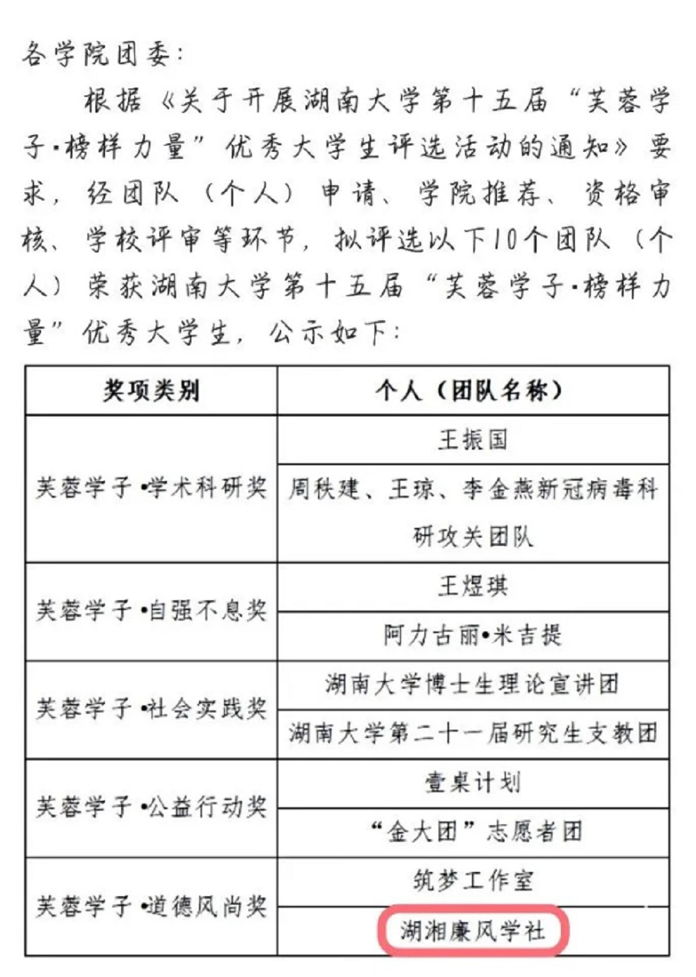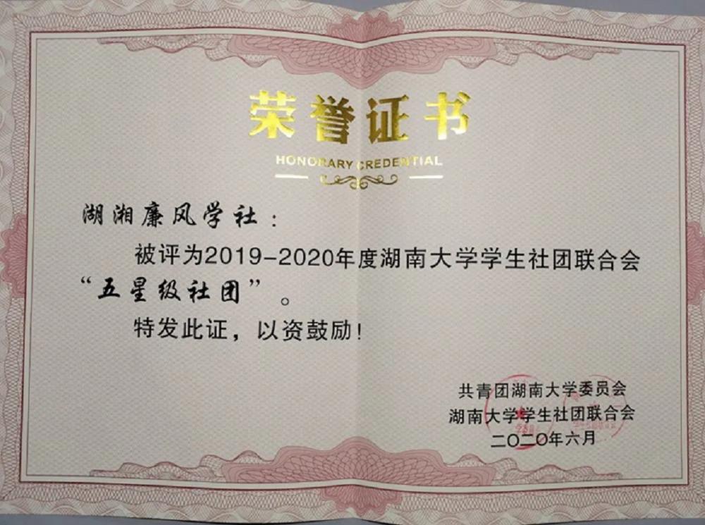 第十五届“芙蓉学子·榜样力量”评选活动中湖湘廉风学社荣获“芙蓉学子·道德风尚奖”;荣获樱花漫画