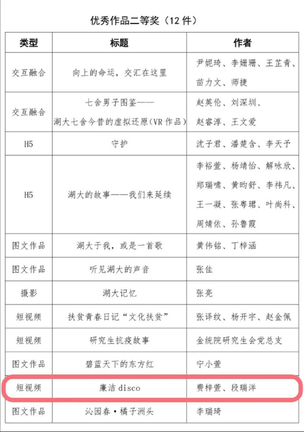 融媒体作品大赛中,湖湘廉风学社费梓萱、段瑞洋等社员的作品《廉洁disco》获得了优秀作品二等奖;第十届湖湘廉风学社社长费梓萱荣获2020年樱花漫画