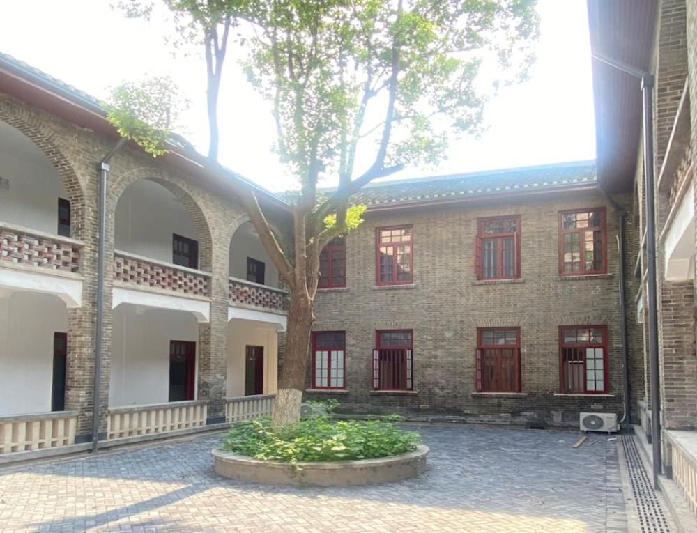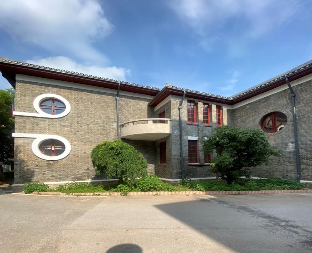 学院办公楼为二层砖木结构,建筑面积2127.8平方米,具有民国时期建筑典型特征,色调古朴。该建筑重点处理了入口部位,其入口平面呈弧形环抱之势,设立半圆柱以及弧形的入口雨棚,其他墙面上用长长的水平线条连接窗台或檐口最后绕成一个圆圈结束,构成了整体上的静止稳定和局部的变化流动,运用了线和圆形母题,具有德国表现主义的特征。