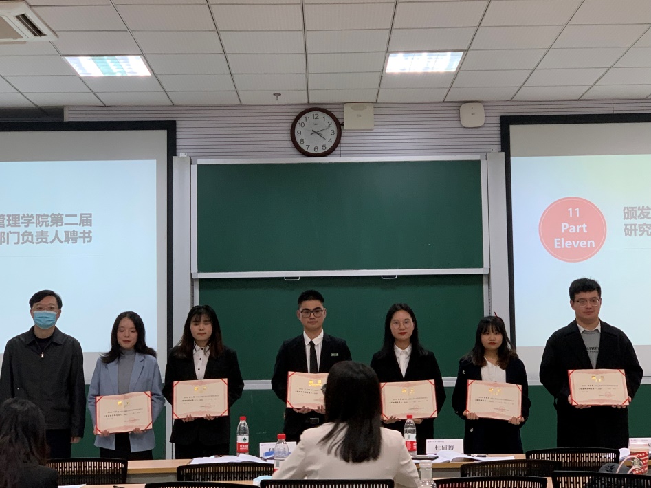 公布无异议后,4位候选人依次上台发表竞选宣言,向参会人员介绍了自己以往的学生工作经历、未来发展规划等。竞选演说结束后,由王浩、王煜超同学进行计票。与此同时,付蓉芬、杜倩博为第二届研究生会主席团成员及各部门负责人颁发聘书。经投票,最终选举吴高鹏、刘亚梅以及胡春晖三名同学为樱花漫画
