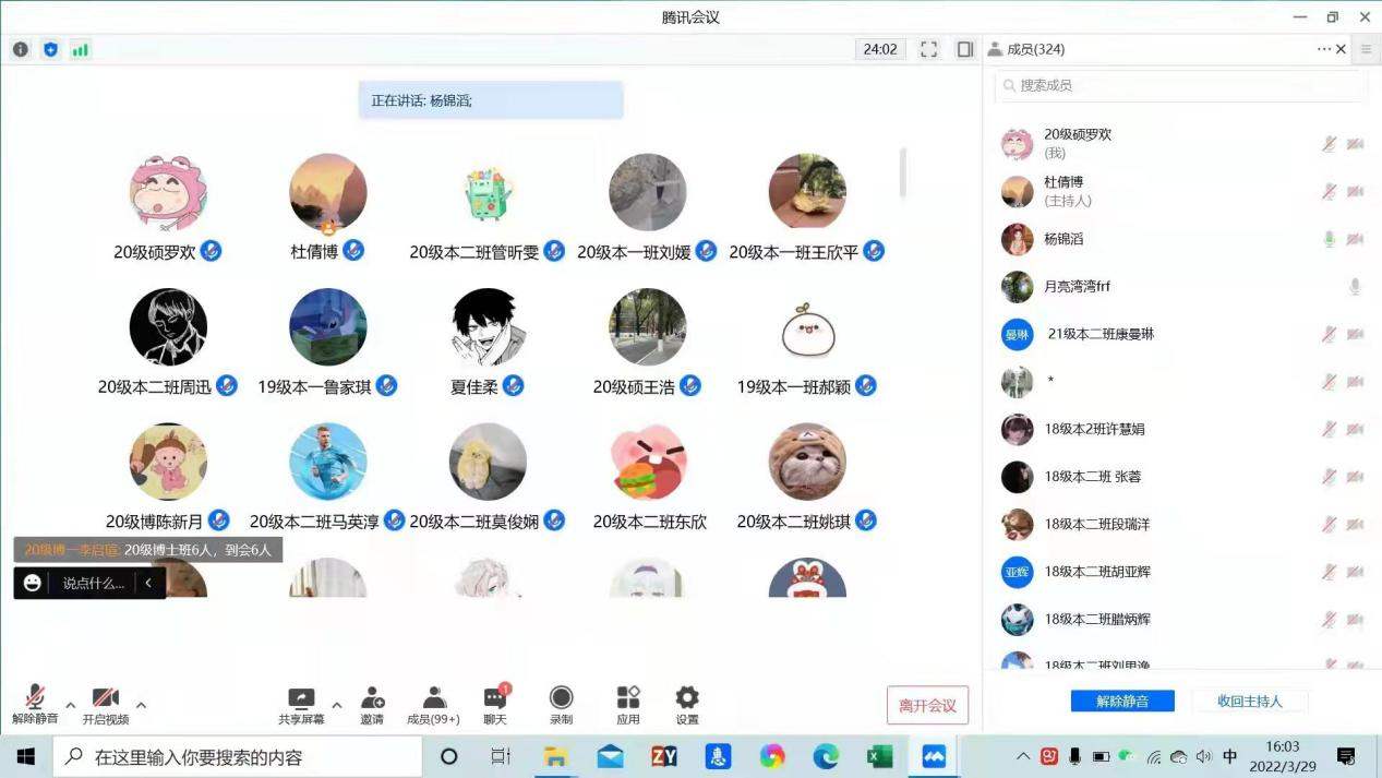 管控区内学生全员核酸检测不漏一人。杜老师与本科生各年级的每个寝室进行了线上交流,与居住在管控区的每一位本科同学通过视频会议的形式见面、畅聊,将关心与建议送到每一位同学身边。杜老师还专门针对暂未签约的2022届毕业生、面临毕业去向选择问题的2023届毕业生,进行了两次线上会议,就同学们关心的问题进行讲解,帮助他们消解各种疑惑。杜老师在管控后的第一时间组建并加入了班长群、寝室长群、利益诉求表达群等工作群,全面及时掌握同学们在管控区内的各种情况,迅速传达学校和学院的各种管理信息,确保了樱花漫画