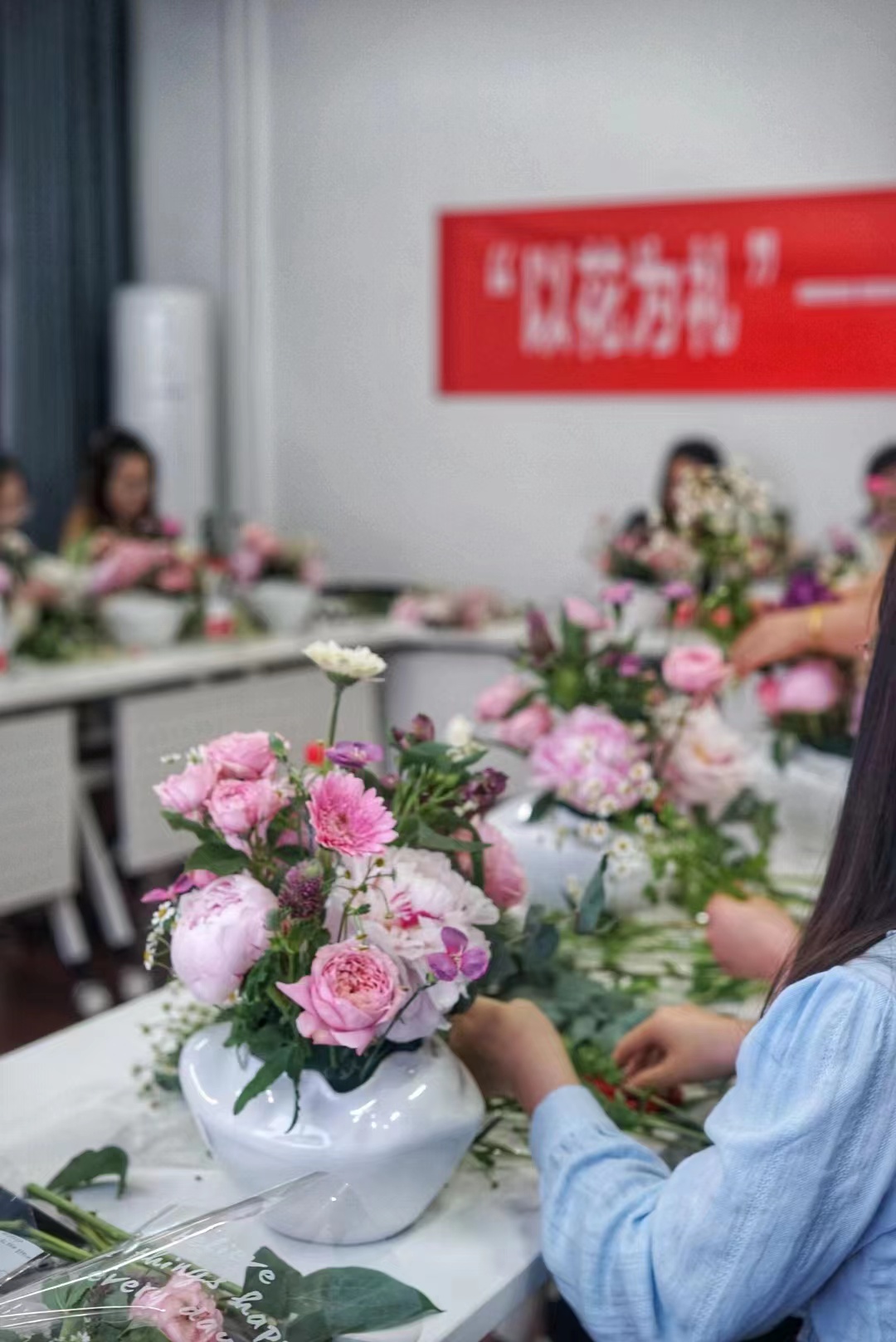 组织开展了“以花为礼”主题艺术插花体验活动。活动邀请了花艺老师现场授课,30余名师生参加。