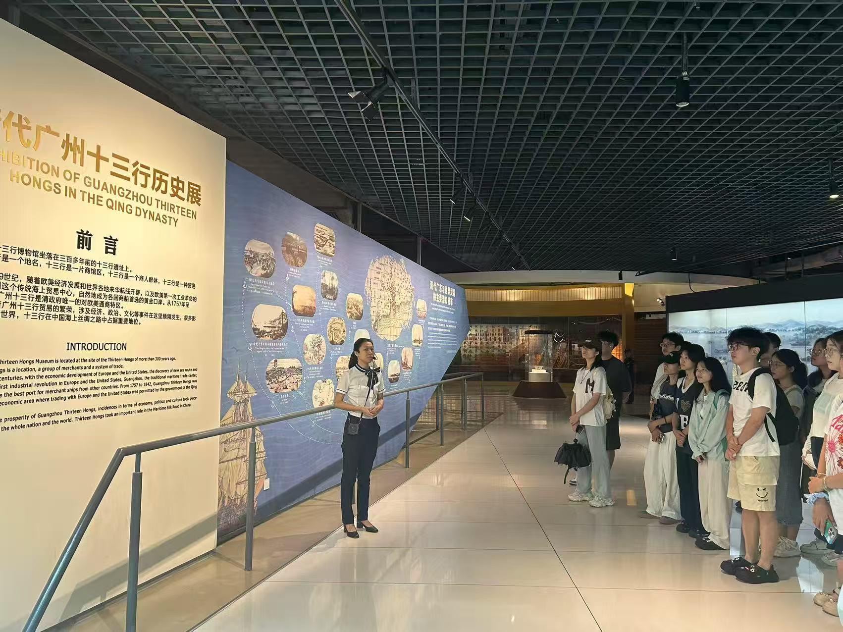 27日清晨,师生来到十三行博物馆。馆内5000余件广彩瓷、通草画、广绣等珍贵文物,生动还原了18世纪广州作为全球贸易中心的繁华图景。同学们从历史治理维度获得双重启示:十三行商会的自治模式,彰显了市场主体自我管理的智慧;清廷海关的税制创新,则体现了制度供给的重要性。这座由社会力量共建的博物馆,既印证着广州“千年商都”的开放基因,也为现代城市更新中平衡商业开发与文化传承提供了珍贵的历史镜鉴。