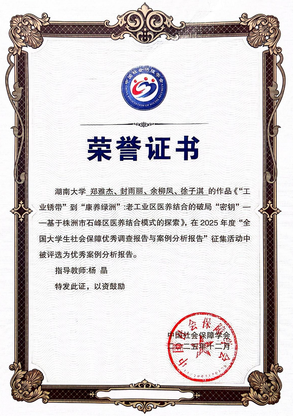 杨晶副教授指导下,由行政管理专业本科生郑雅杰、余柳凤、封雨丽、徐子淇合作完成的案例分析报告从全国高校213份案例分析报告中脱颖而出,最终荣获2025年度“优秀案例分析报告”奖。