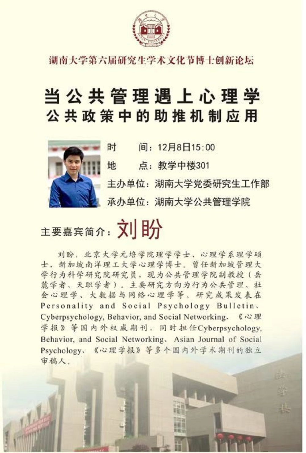 本次博士论坛以“当公共管理遇上心理学:公共政策中的助推机制应用”为主题,特邀刘盼副教授作为本期论坛的主讲嘉宾。以心理学与公共管理学科交叉研究为起点,漫谈公共政策中的助推机制应用,以及实验研究法在公共政策研究的应用。