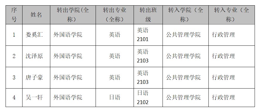 经过学生本人申请,转出学院审核,转入学院面试审核,以下4名学生转入行政管理专业申请审核通过,现予以公示,公示期三天。如有异议,请在公示期里实名据实向学院反映。联系人:赵老师,联系电话88821399,邮箱[email protected]。