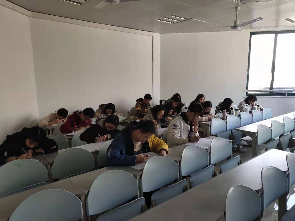 本次考试题型分为单选、判断、填空、简答四部分,院党委书记付蓉芬担任巡考员,监考工作由党务与人才培养工作办公室主任杨锦滔和学生辅导员王浩负责。共91名学生参加考试。