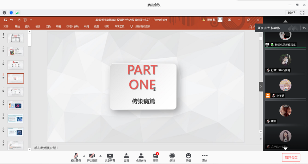 最后,为保证新生在军训期间的身体安全,桂院长对军训期间常见疾病的防治和急救做了重点讲解。军训期间常见中暑、踝关节扭伤、食物中毒、鼻出血等疾病,其中中暑最为普遍且较为危险,严重可致人死亡。桂院长分享了中暑的预防措施、现场急救措施以及常备防暑药,通过往年经历提醒新生助理多注意观察新生身体情况,随时做好处理紧急情况的准备。在举足轻重的抢救手段徒手心肺复苏术(CPR)方面,桂院长强调“时间就是生命”,教导大家抓住“黄金四分钟”,通过文字讲解和视频展示的方式向大家详细介绍了徒手心肺复苏术的各个流程标准和要点,使新生助理们充分地了解急救知识和抢救时间的重要性。