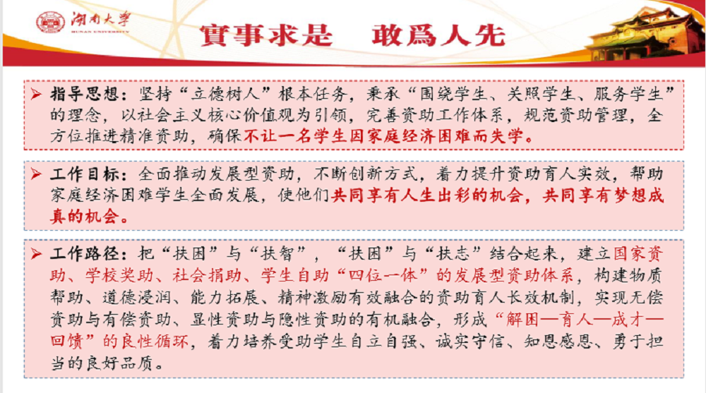 在资助理念部分,塔木老师介绍道,学校学生资助工作始终坚持秉承“围绕学生、关照学生、服务学生”理念,以社会主义核心价值观为引领,完善资助工作体系,规范资助管理,全方位推进精准资助。在确保“不让一名学生因家庭经济困难而失学” 的同时,于更高程度上全面推动发展型资助,不断创新资助方式,着力提升资助育人的实效,帮助家庭经济困难学生全面发展,从而达到每一名学生“共同享有人生出彩的机会,共同享有梦想成真的机会”的工作目标。