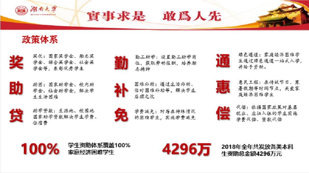 在资助政策部分,塔木老师介绍道,学校的资助政策已经形成了涵盖奖学金、助学金、助学贷款、勤工助学、苦难补助、学费减免、绿色通道、惠民工程、学费补偿的“奖助贷、勤补免、通惠偿”九字政策体系,实现了家庭经济困难学生100%全覆盖,在2018年共发放各类本科生资助总额达4296万元。