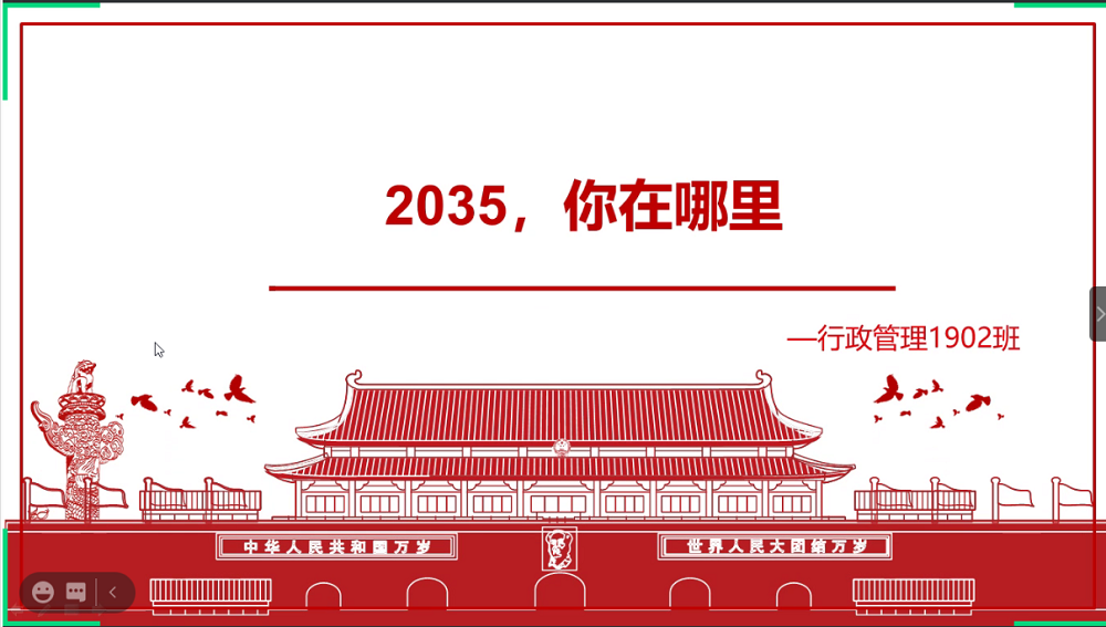 以宣传党的十九届五中全会工作精神为主要目标,以激励青年学生展望未来、努力奋斗为主要方向,12月24日,行政管理1902团支部通过线上方式召开了“2035,我们在哪里”主题团课。本次团课由团支书李宏圳主持召开,1902班全体同学参加。