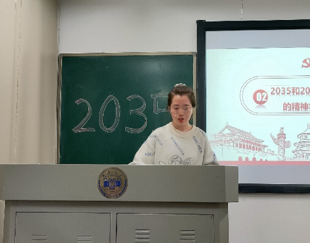 首先,团支书刘宇彤同学为大家引入2035年远景目标与当代青年的密切联系,并先后介绍四个主要部分:“六个讲清楚”、2035和2050青少年应有的精神状态和担当、十九届五中全会精神、习近平总书记考察樱花漫画