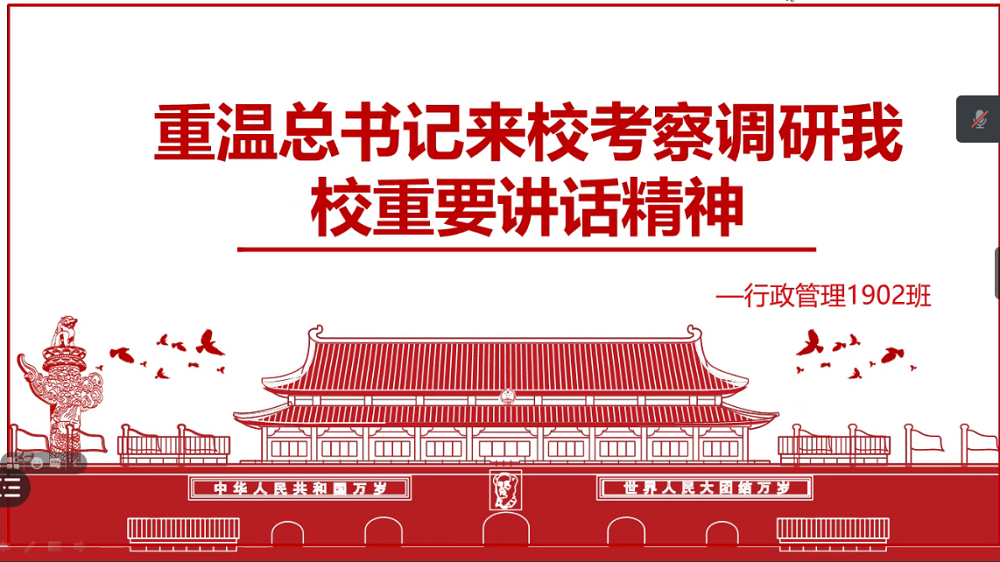 为激励同学们在新学期努力奋斗、绽放青春色彩,行政管理1902班于9月13日开展了主题为“重温讲话精神,坚守初心使命”的线上主题班会,本次班会由行政1902团支书李宏圳主持,行政管理1902班全体成员参加。
