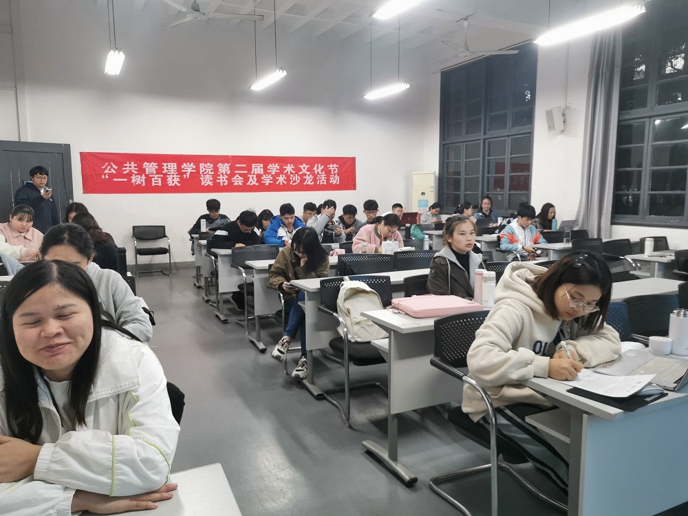 第二届学术文化节系列活动之一“一树百获”读书会及学术沙龙活动于教学东楼214教室顺利开展。本次读书会由行政管理1901班与1902班联合举办,行管1901班与1902班全体成员参与。