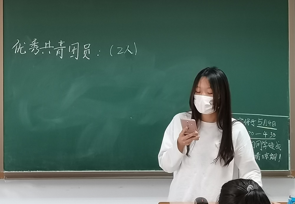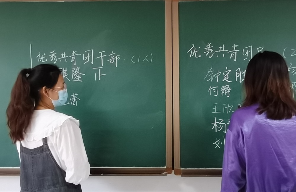 投票完毕,由高晓蕾同学收齐选票,曲文英同学唱票,韩静同学计票,姚璐同学监票。最终,在全体在场同学的监督下,王麒隆同学获评“优秀共青团干部”,王欣平、何静同学获评“优秀共青团员”。