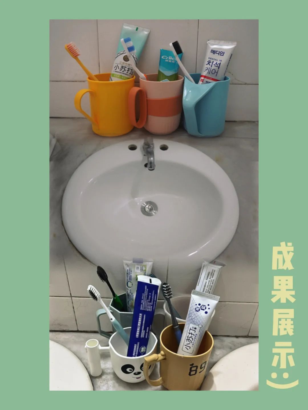 有序摆放的洗漱用具、洁白透亮的洗手池、