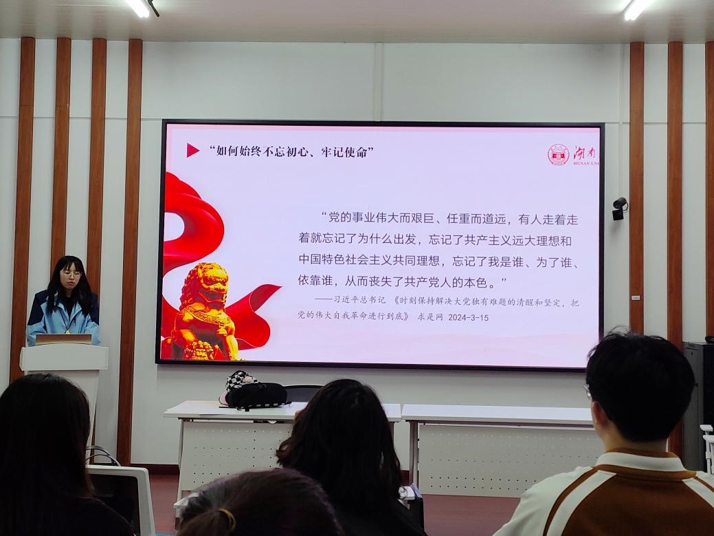 首先,与会党员就“如何始终不忘初心、牢记使命”这一问题展开思考,张佳结合习近平总书记在《时刻保持解决大党独有难题的清醒和坚定,把党的伟大自我革命进行到底》中的发言,对初心与使命的命题进行了解读,党员须得时时警醒,保持共产党人的本色,为中国人民谋幸福,为中华民族谋复兴。