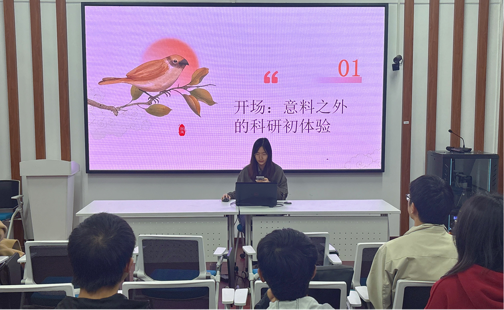 2022级本科生王培睿和2023级硕士研究生刘仪航参与分享,她们在第十九届“挑战杯”国赛和第八届“互联网+”国赛中获得了优异成绩。活动由研究生会科研创新部成员李彦瑶主持,吸引了来自各年级的20余名学生参与。