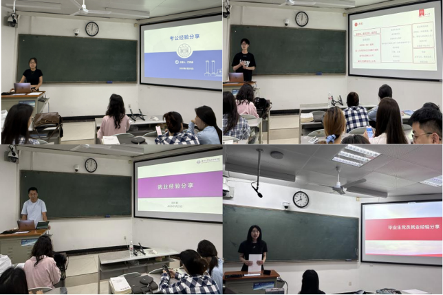 传承榜样力量,开展一场经验分享活动。硕士生第一党支部2025届硕士毕业生党员代表闫振振、江奕涵、段仁富、硕士生第二党支部代表张佳为学弟学妹们分享就业与成长经验,通过讲述自身求职历程、职业规划心得以及在学习生活中的感悟,为低年级党员提供宝贵参考。