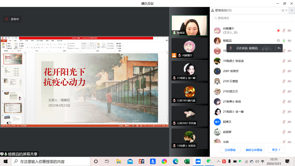 开展以“花开阳光下,抗疫心动力”为主题的全体本研学生心理骨干线上培训。培训由学院党务与人才培养办公室主任、研究生辅导员杨锦滔主持,学院本研各班心理委员、院研究生会骨干参会。