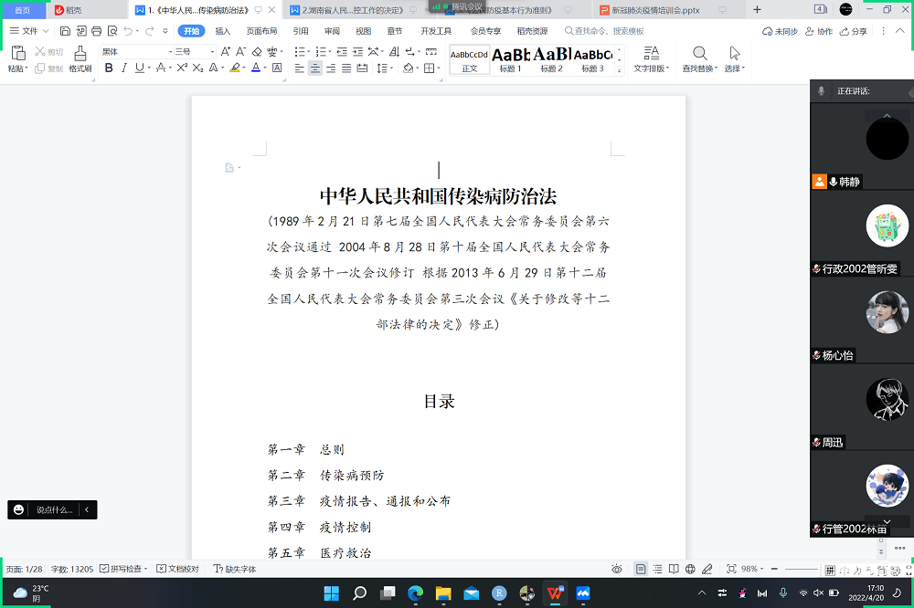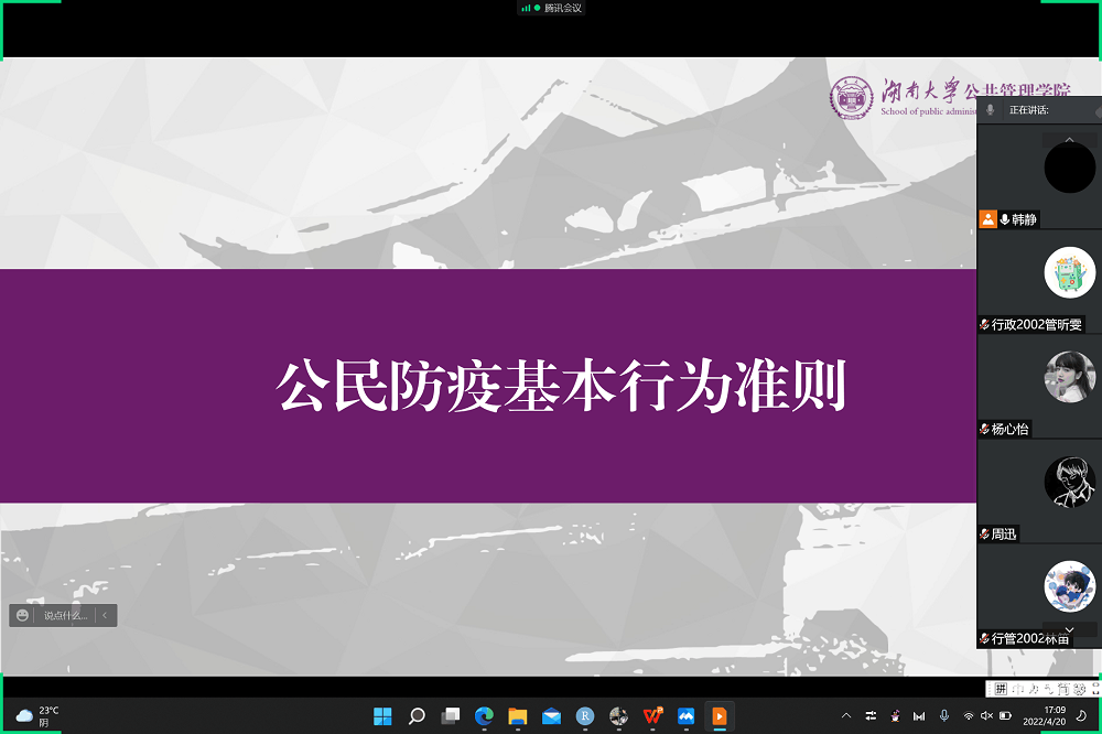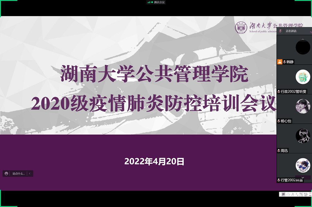 行政管理专业2020级全体成员参会。培训主题为法律法规与行为准则,会议聚焦于学习与解读以下三份疫情防控政策文件:《中华人民共和国传染病防治法》、《湖南省人民代表大会常务委员会<关于科学精准及时有效做好全省新冠肺炎疫情防控工作的决定>》、《公民防疫基本行为准则》。