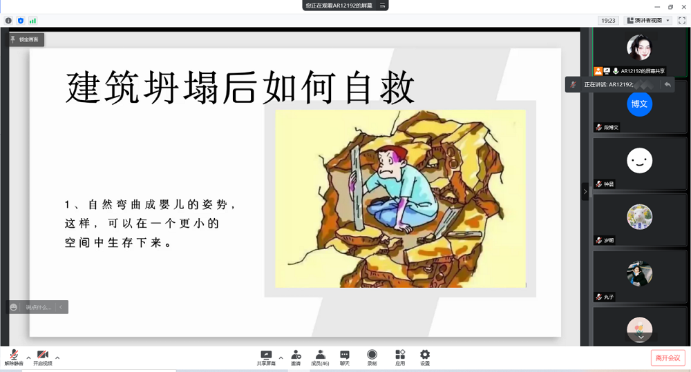 首先,徐一峰回顾长沙市望城区金坪社区居民自建房发生倒塌事故的相关情况。接着,徐一峰从建筑坍塌前的预兆,建筑坍塌后如何自救两个方面进行了详细的讲解。对于建筑坍塌前的预兆,主要包括地面突然下陷;承重柱、梁、板或墙体出现严重裂缝;墙体或天花的批荡层突然大面积剥落等,同学们应当小心留意。对于建筑坍塌后如何自救,应该做到小心移动身体,以防更大的残骸砸到自己身上;护住口鼻以防粉尘污染;设法用手和其他工具开辟通道逃出等措施,避免或者减少危机给自己带来的不利影响。