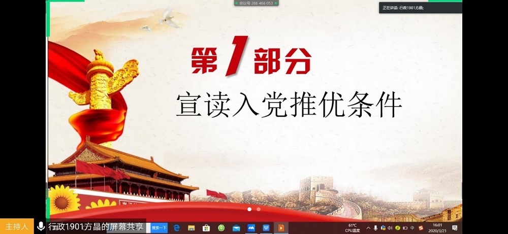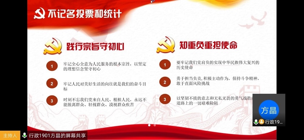 3月21日,行政管理1901班团支部于线上开展入党推优大会,本次会议由团支书方晶主持。