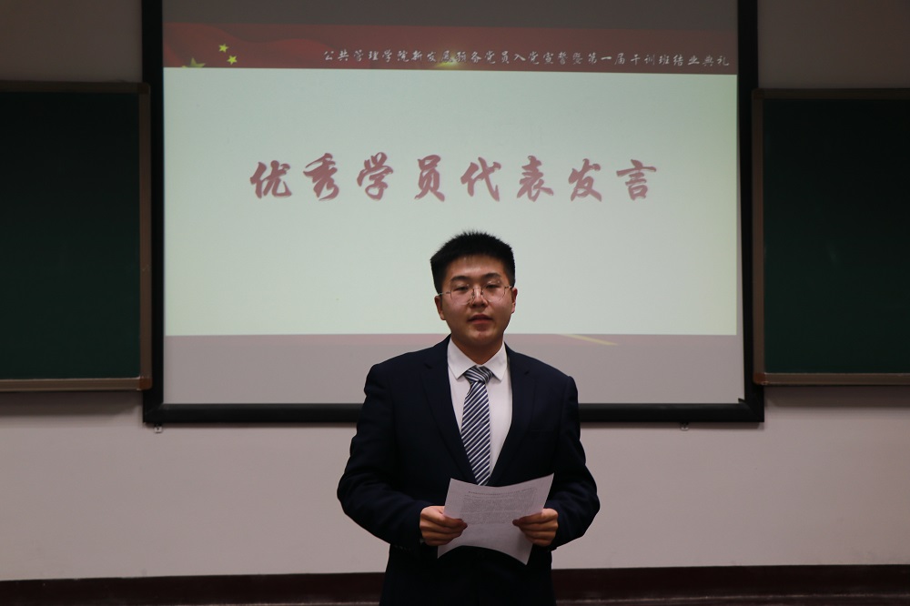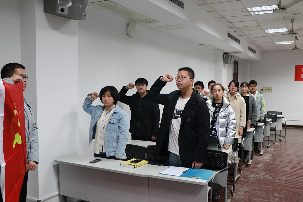 2019年下半年新发展预备党员名单。随后,王浩老师带领全体2019级下半年新发展预备党员面向党旗,庄严宣誓。2017级本科生石一琨同学作为预备党员代表发言,“习总书记说:我们都是追梦人,希望座各位同学一同努力奔跑,一起争做追梦人。”