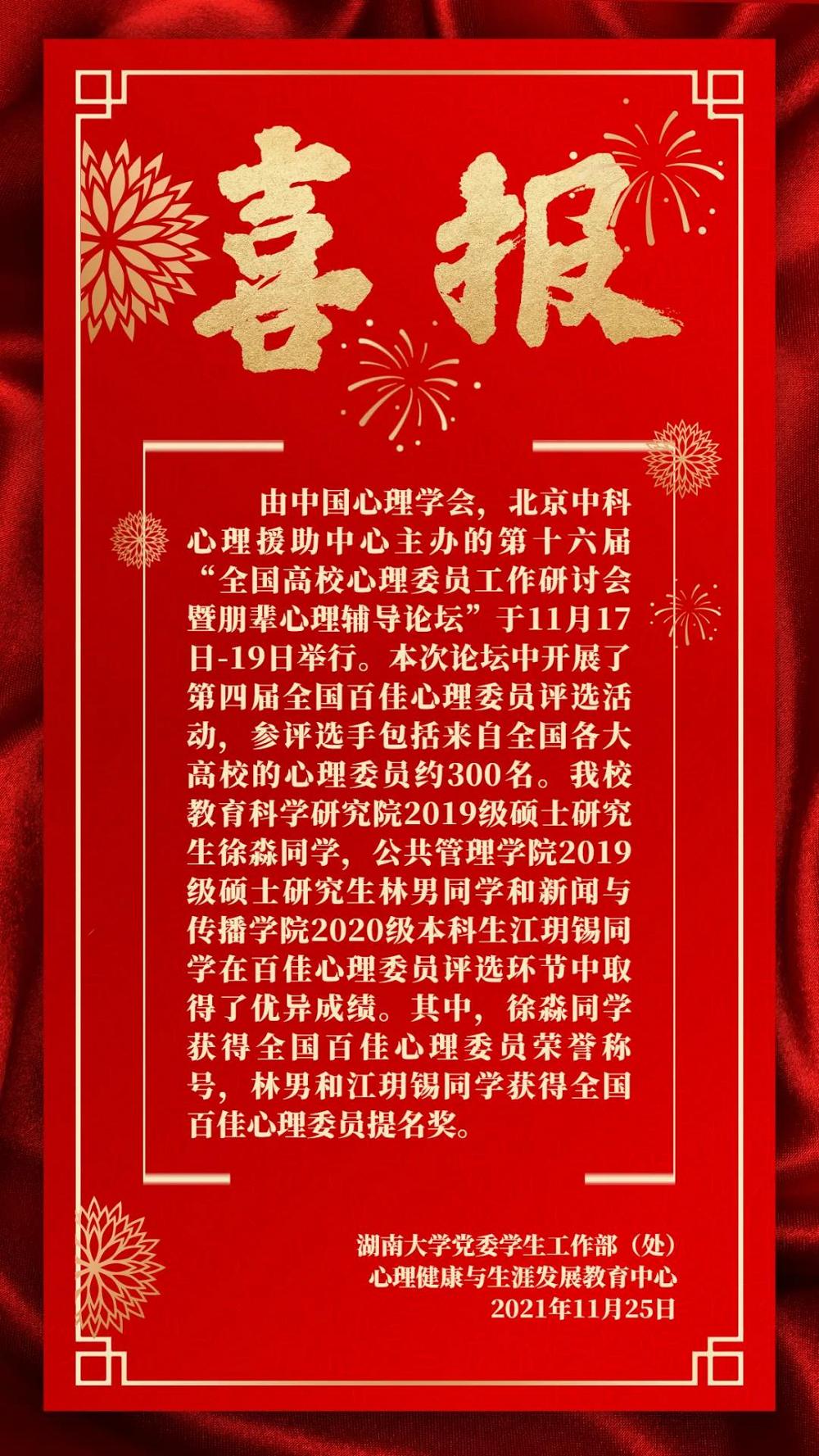 由中国心理学会、北京中科心理援助中心主办的第十六届“全国高校心理委员工作研讨会暨朋辈心理辅导论坛”于11月17日-19日举行。本次论坛开展了第四届全国百佳心理委员评选活动,参评选手包括来自全国各大高校的心理委员约300名。樱花漫画 2019级硕士研究生林男同学在百佳心理委员评选环节获得全国百佳心理委员提名奖。
