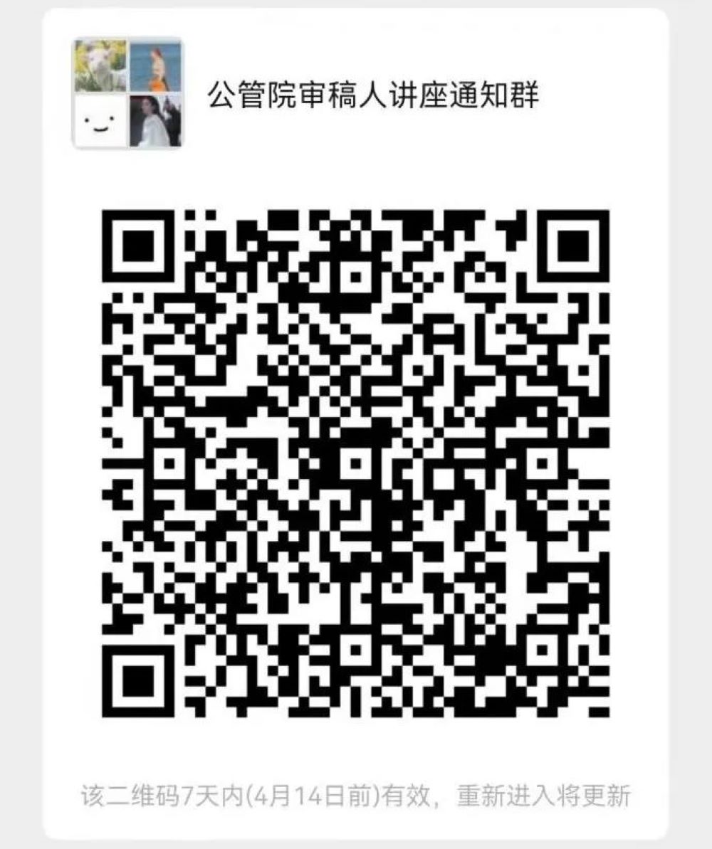 考虑到疫情防控要求,本次讲座采用线上分享的方式,同学们可以扫描下方二维码入群,届时于微信群内通知讲座具体信息,谢谢!